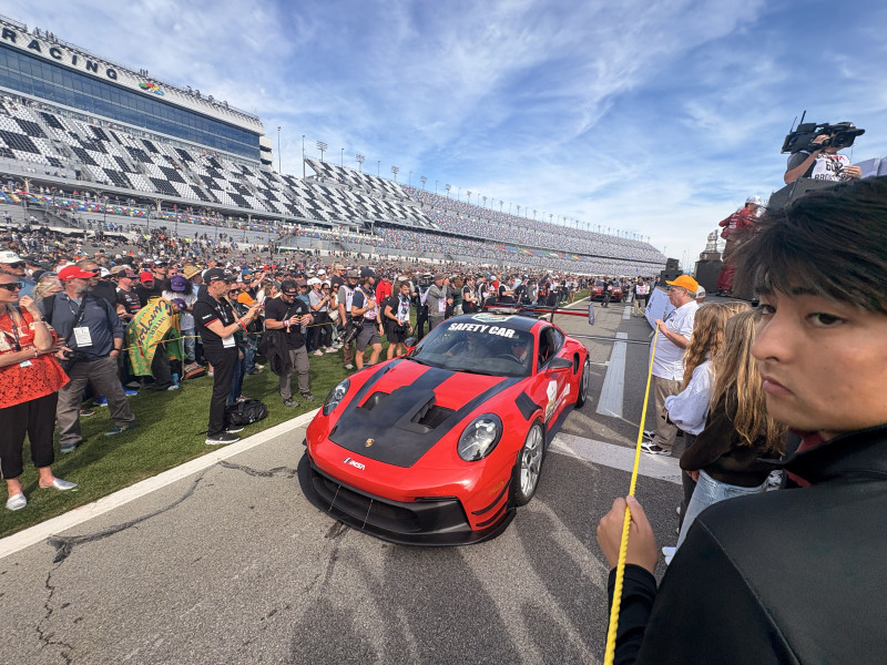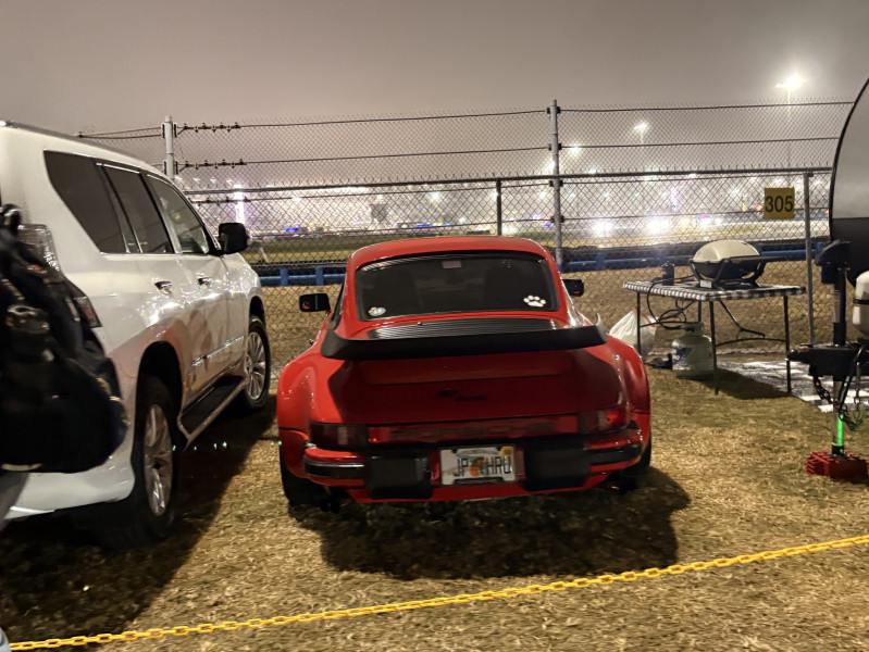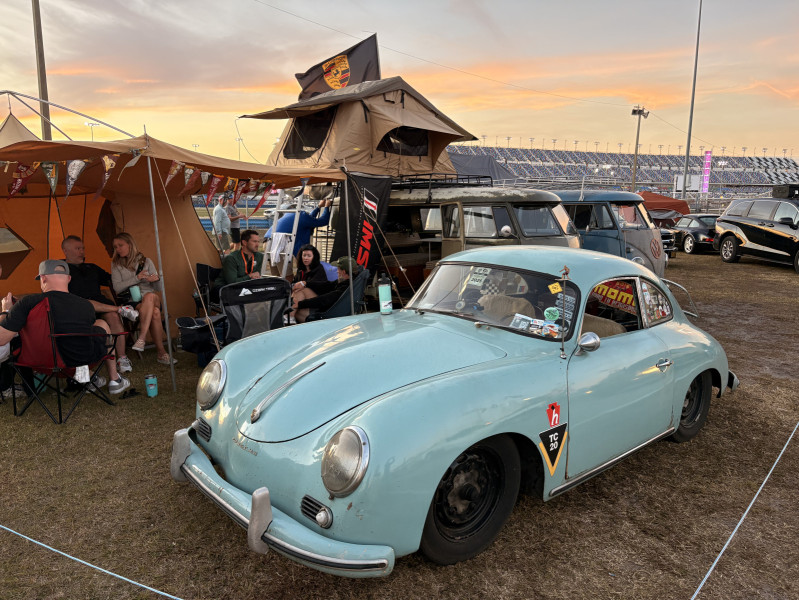 Porsche fans zijn ook talrijk te vinden op de kampeerterreinen binnen en buiten het circuit. Bij vele tenten en campers zijn Porsche vlaggen te vinden, naast de onmisbare barbecues, koelboxen en wat er voor een bezoek aan een Amerikaanse autorace verder allemaal nog bij hoort. Daarbij hadden ze ook dit jaar weer wat te vieren, want opnieuw behaalde Porsche de overwinning in de klassieke race in Daytona. Die was wel bijzonder, want niet alleen was er een recordaantal bezoekers (officiële cijfers geeft de Amerikaanse organisatie nooit), maar ook werd in de nacht meer dan zesenhalf uur achter de safety-car gereden, ook een record. De reden van de neutralisatie was de dichte mist, waardoor het zicht zo slecht was dat het niet verantwoord was om de auto’s op normale racesnelheid te laten rijden. “Je zag echt niks: op het rechte stuk aan de achterkant moest je soms maar op goed geluk insturen om de bocht te halen”, vertelde Porsche coureur Laurin Heinrich naderhand.
