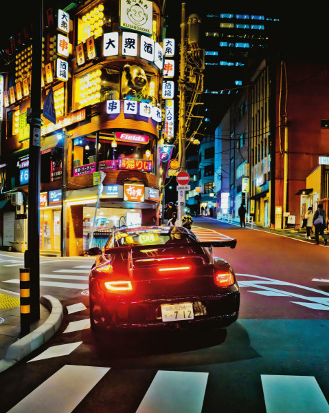 “Ik ben al sinds mijn kindertijd gek op Porsche, sinds ik een speelgoedmodel van de 930 had,” vertelt Taca terwijl we instappen in zijn 911 GT3 RS (997), geparkeerd voor zijn bar, pal achter de volledig elektrische Macan Turbo die we van Porsche Japan hebben geleend. De GT3 RS is slechts één van de vele sportwagens uit Zuffenhausen die hij door de jaren heen heeft gehad. “In Tokio moet je eerst je parkeerplaats regelen voordat je een auto kunt registreren, dus ik ben beperkt tot vier Porsches tegelijk,” legt Taca uit.