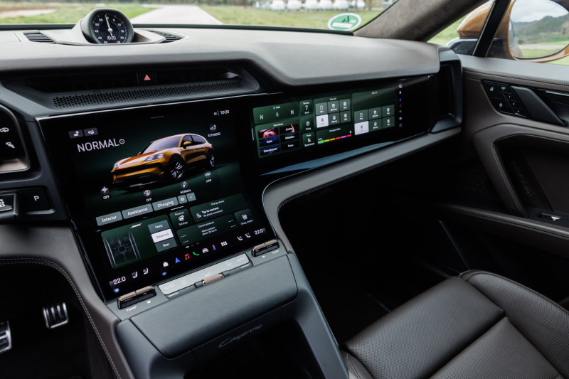 “Een andere herkenbare eigenschap van de Cayenne Electric is het ontbreken van de handgrepen op de middenconsole, tot dusver een sterk kenmerk van de identiteit van de middenconsole in elke Cayenne. Daardoor is er daar nu enorm veel opbergruimte, met dubbele bekerhouders en dubbele draadloze opladers. En er is een rolscherm, zodat je het hele vak kunt afsluiten.”